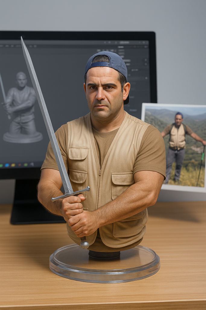 Neste processo, combinámos fotografia, modelação 3D e inteligência artificial. Inicialmente, partimos da fotografia do formador. Em seguida, utilizámos uma ferramenta de IA que transformou essa imagem num busto tridimensional. A IA analisou a fotografia, identificou padrões e características faciais. Depois, criou uma versão digital cheia de detalhes realistas da pele, da roupa e da pose com a espada.